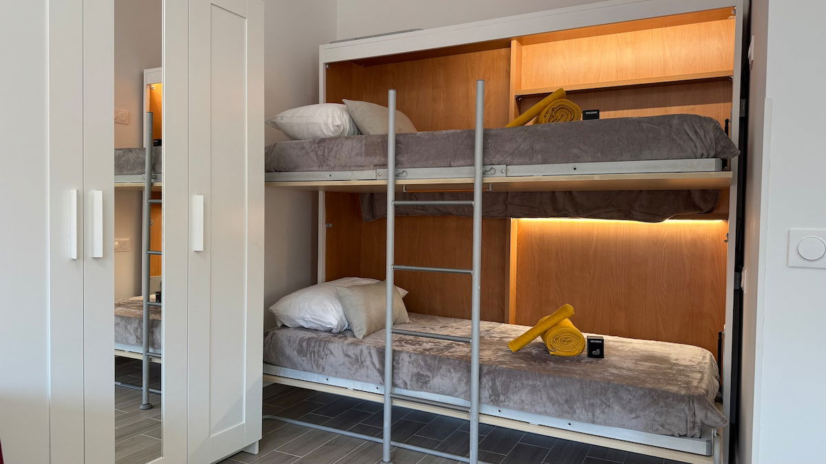 Sleeping Area: Immerse yourself in the comfort of the sleeping area, featuring a high-end queen-size sofa bed and two single bunk beds, perfect for children. This restful haven is designed for the whole family. The natural light that fills the room creates a soft and soothing ambiance, ideal for recharging after a day of exploring.